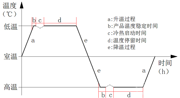 熱循環(huán)試驗(yàn)是一種利用高低溫交變濕熱試驗(yàn)箱對試驗(yàn)產(chǎn)品進(jìn)行的預(yù)設(shè)高低溫交替的應(yīng)力考核,用以驗(yàn)證材料和產(chǎn)品是否達(dá)到在研發(fā)、設(shè)計(jì)、制造中預(yù)期的質(zhì)量目標(biāo)的一類可靠性試驗(yàn)。通過大溫變速率可暴露產(chǎn)品潛在的材料與性能缺陷,經(jīng)過不斷地質(zhì)量改進(jìn),達(dá)到可靠性提升的目的。航天單機(jī)類產(chǎn)品一次熱循環(huán)示意圖見下圖1所示。